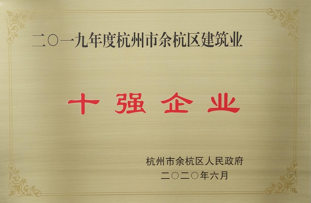 再次荣获“余杭区建筑业十强企业”称号,是对我司过去一年来企业经营成果的充分肯定和鼓励,并期许我司在新的一年里,以更加昂扬向上的精神状态和饱满的工作热情,紧抓机遇谋发展,坚定信心抓落实,为全区经济建设做出更大贡献。