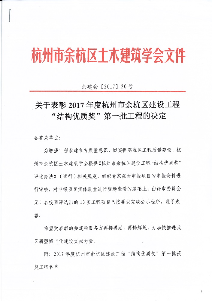 我司荣获2017年度杭州市余杭区建设工程“结构优质奖”第一批工程的通报表彰
