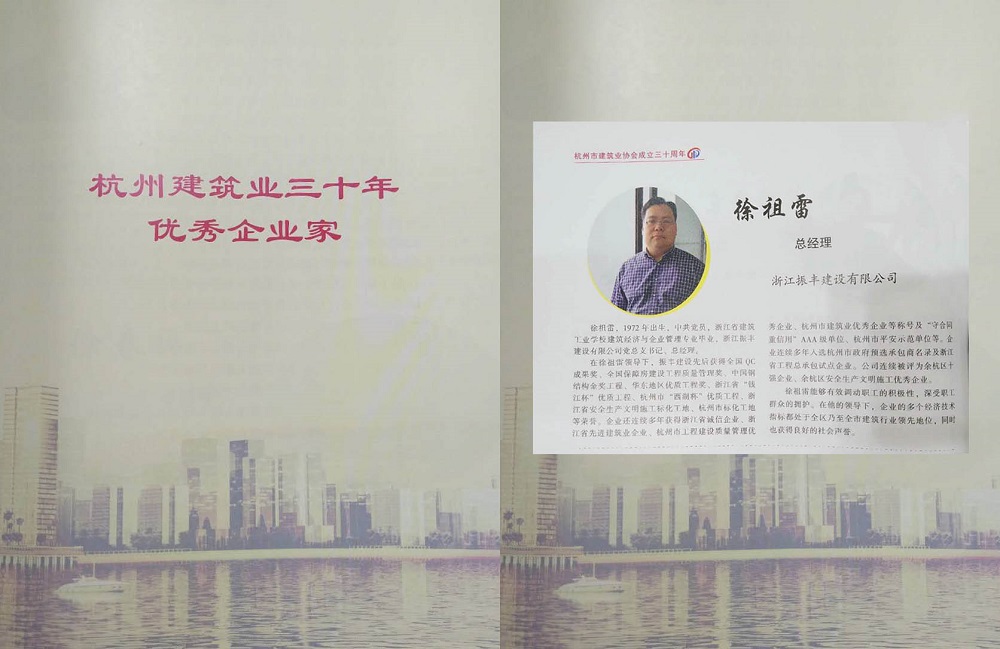 2018年12月27日,杭州市建筑业协会在杭州千越酒店成功召开了五届三次会员代表大会暨协会成立三十周年纪念大会。会上公布表彰了杭州市建筑业三十年各类先进,我司亦榜上有名,被评为“杭州市建筑业三十年优秀企业”称号。公司总经理徐祖雷同志被评为优秀企业家称号。