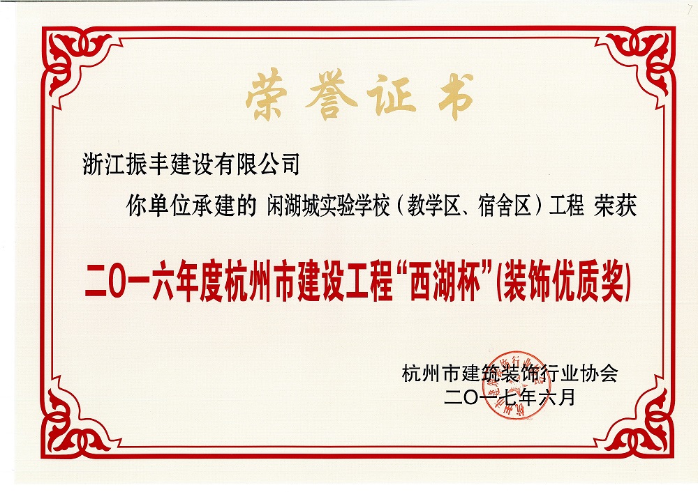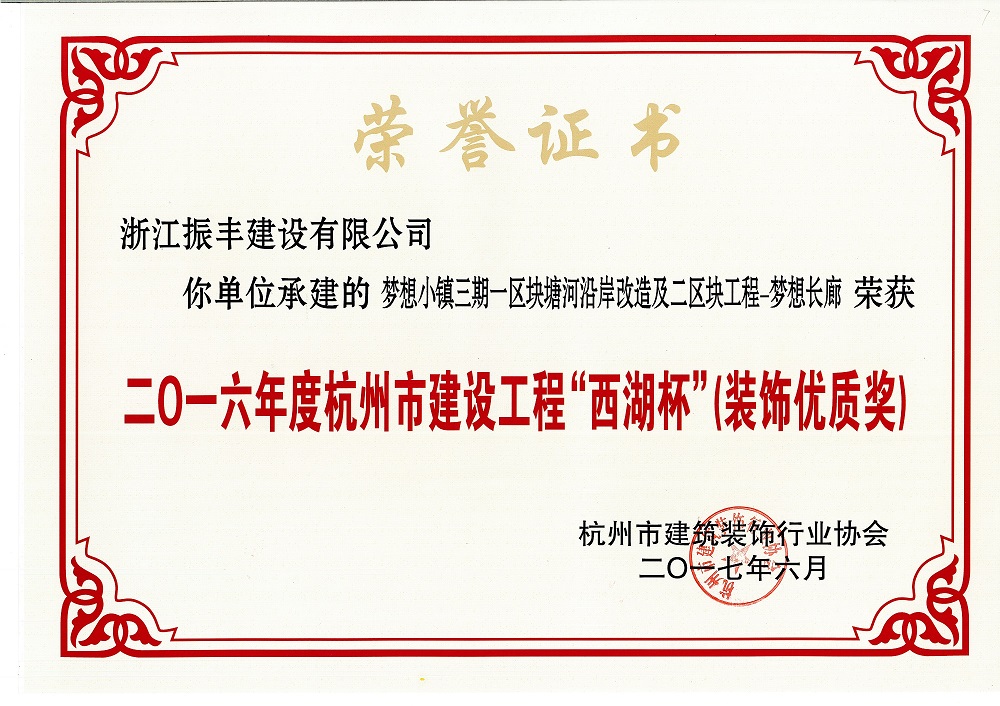 近日,从杭州市建筑装饰行业协会传来喜报,我司承建的梦想小镇三期一区块塘河沿岸改造及二区块工程——梦想长廊工程、闲湖城实验学校(教学区、宿舍区)共两个工程,荣获2016年度杭州市建设工程“西湖杯”(装饰优质奖)。