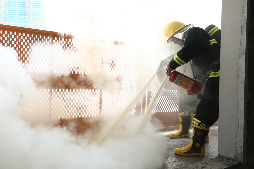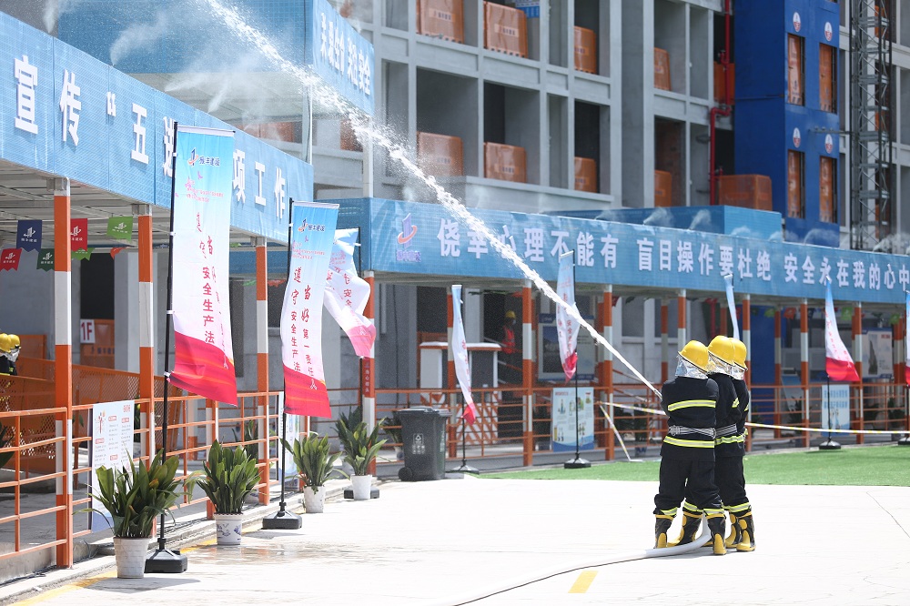 观摩会上还进行了消防应急演练,通过对突发事件的应急反应和处置等方面的组织和协调,让参会人员更加深入的了解工地应急预案的重要性,提高应预案的实用性和可操作性。
