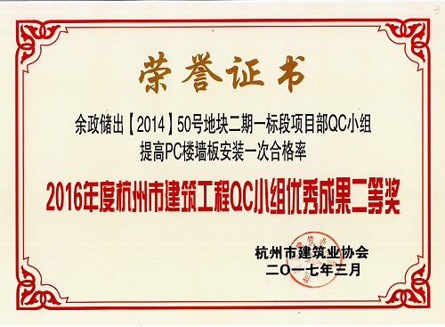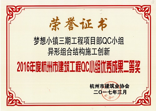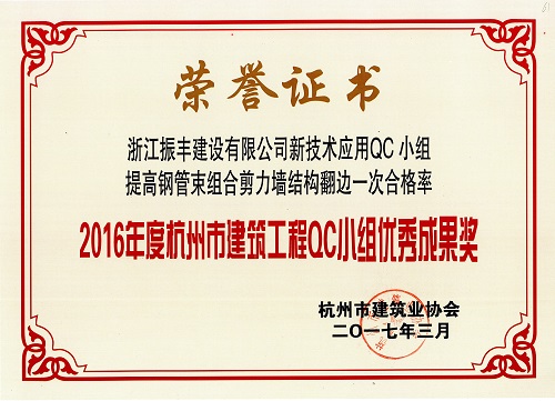 近日,从杭州市建筑业协会传来喜讯,我公司梦想小镇三期项目QC小组的“异性组合结构施工创新”及余政储出【2014】50号地块二期一标段项目QC小组的“提高PC楼墙板安装一次合格率”、公司新技术应用QC小组的“提高钢管管束组合剪力墙结构翻边一次合格率”三项QC成果分别获得2016年度杭州市建筑工程QC小组优秀成果二个二等奖及一个优秀成果奖。