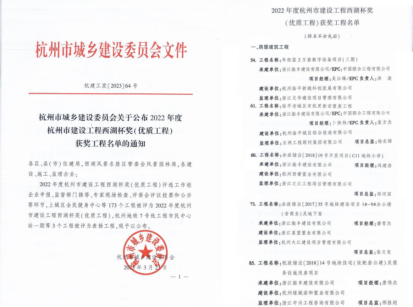近日,由我司承建的年组装2万套数字设备(三期)、临平老城区有机更新安置房、余政储出【2018】19号开发项目(C11地块小学)、余政储出【2017】35号地块建设项目1#-9#办公楼(含商业)及地下室、杭政储出【2018】14号地块住宅(设配套公建)及服务设施用房项目等五个工程,荣获2022年度杭州市建设工程“西湖杯”(优质工程奖)。