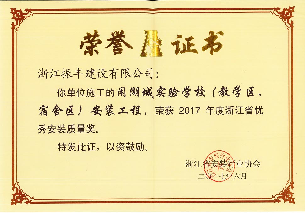 贺我司承建的闲湖城实验学校(教学区、宿舍区)安装工程喜获2017年度浙江省优秀安装质量奖