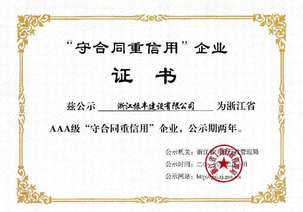 为促进企业信用建设,树立诚实、守信的良好经营风尚,日前,2018年浙江省AAA级“守合同重信用”企业评选揭晓,浙江振丰建设有限公司顺利续展。这一殊荣是浙江省工商局对企业信用的最高评价。