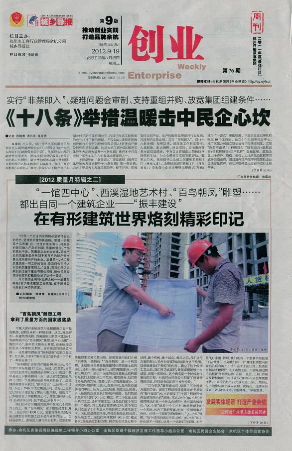 9月19日,杭州市余杭区《城乡导报》刊登了对我公司的采访报道,公司总经理徐祖雷在公司总部会议室接待了采访组一行。