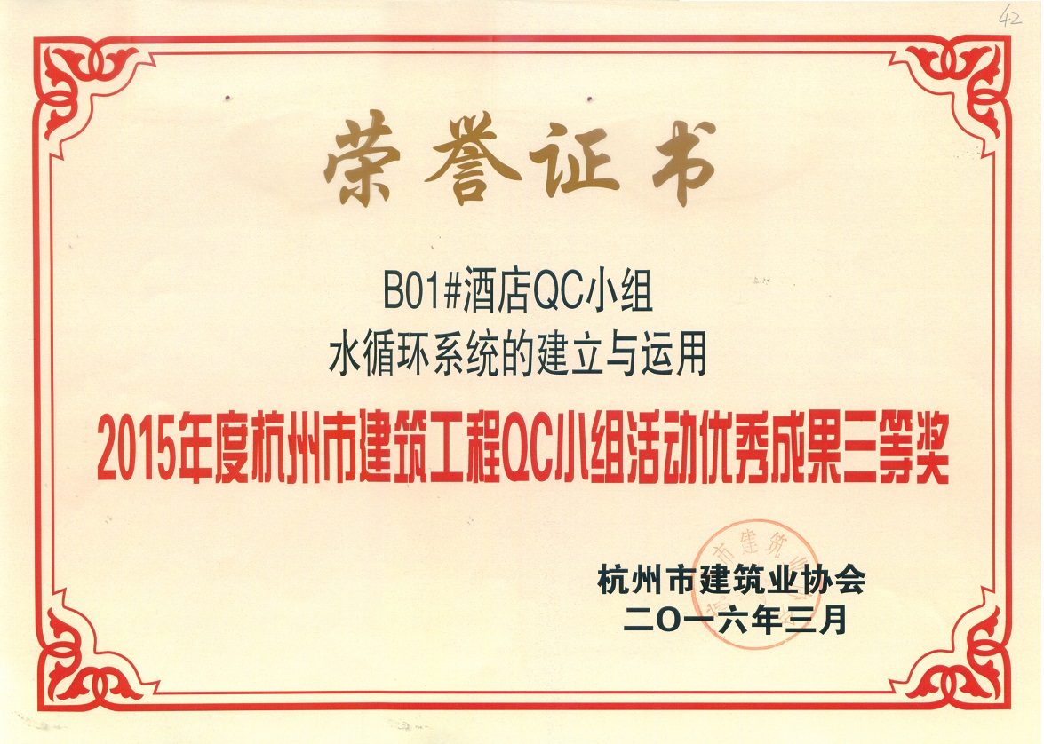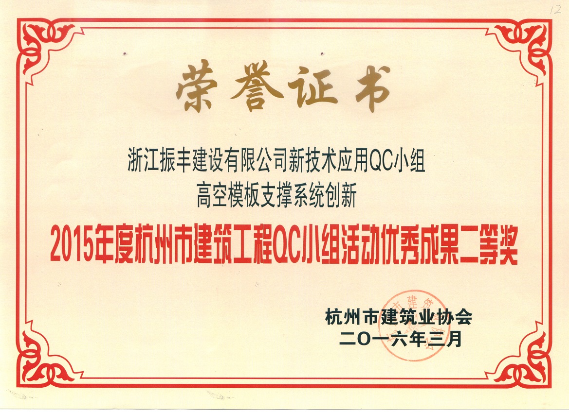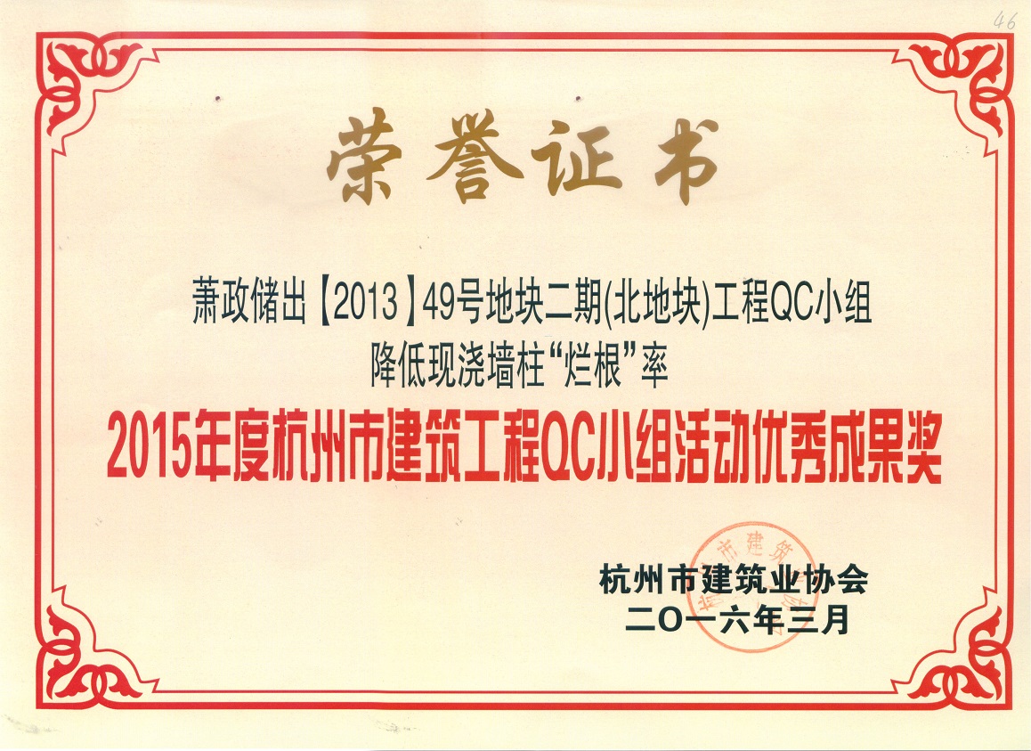 近日,从杭州市余杭区建筑业协会传来喜讯,我公司申报的QC成果荣获2015年度杭州市建设工程QC小组活动优秀成果二等奖、三等奖、优秀成果奖各一项。