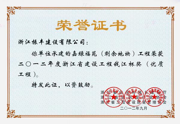 近日,浙江省建筑行业协会传来喜报,我公司承建的“嘉绿福苑”工程获浙江省优质工程“钱江杯”,这是公司多年来第一次获此殊荣。浙江省建筑行业水平在全国是一直处于领先地位,其“钱江杯”含金量也相当之高。而在这次复评中,嘉绿福苑工程项目以杭州市、浙江省均排名前列的好成绩获得了浙江省建筑筑行业评优专家小组的一致好评。为我公司实现该级别奖项的突破迈出了最坚定的一步!