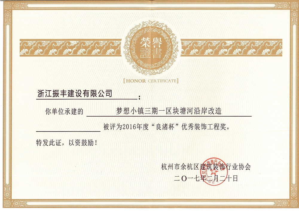 近日,从杭州市余杭区建筑装饰行业协会获悉,我司承建的闲湖城实验学校(教学区、宿舍区)工程和梦想小镇三期一区块塘河沿岸改造两个工程荣获2016年度良渚杯优秀装饰工程奖殊荣。