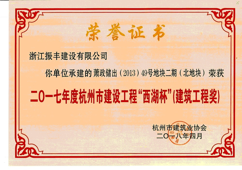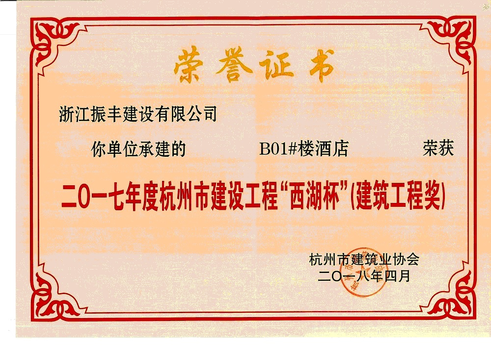近日,从杭州市建筑业协会获悉,我司承建的B01#楼酒店工程和萧政储出(2013)49号地块二期(北地块)工程双双荣获2017年度杭州市建设工程“西湖杯”(建筑工程奖)殊荣。