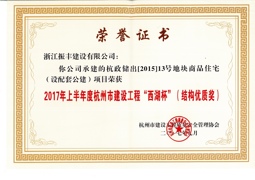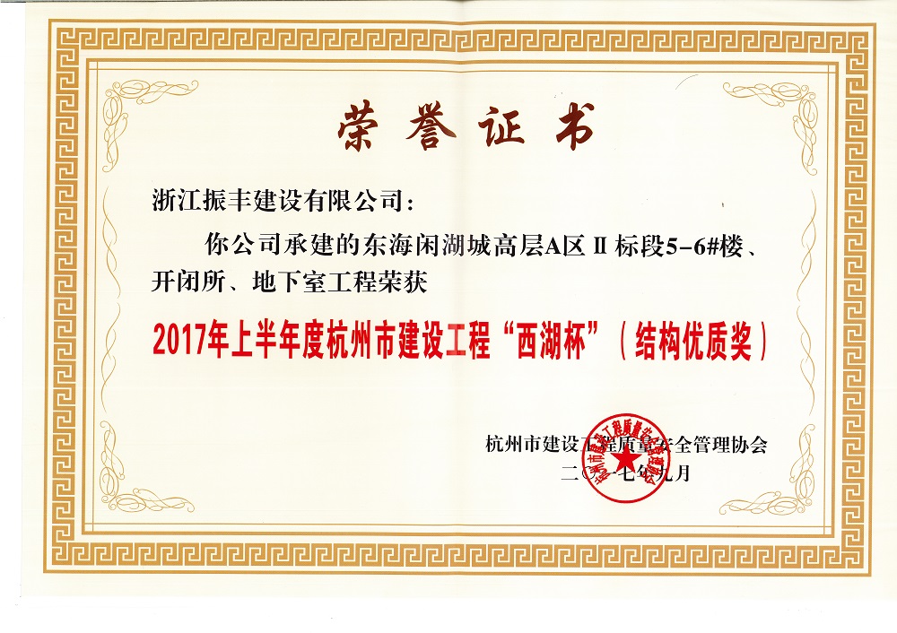 贺我司喜获2017年上半年度杭州市建设工程“西湖杯”(结构优质奖)