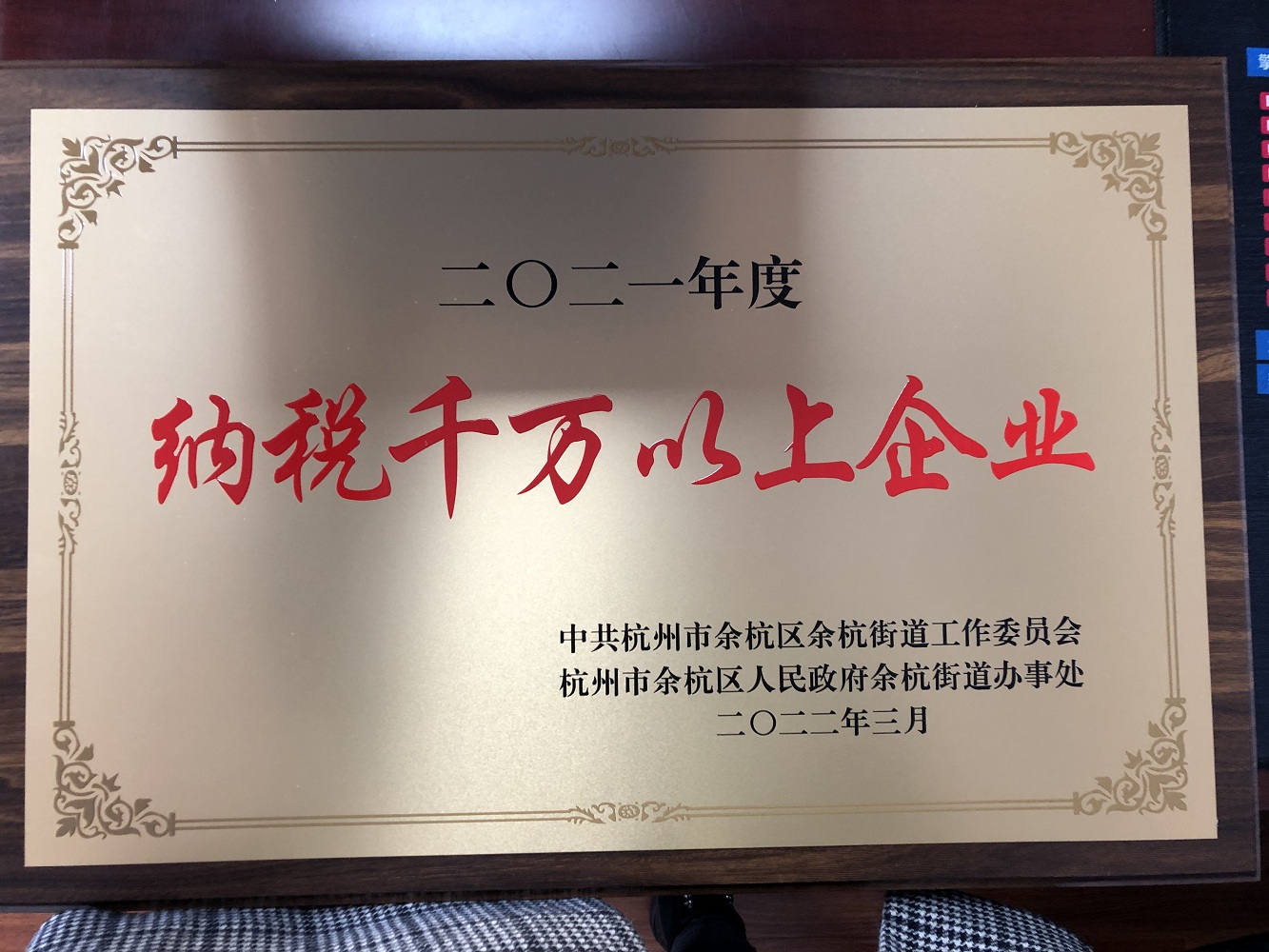 2022年3月中共杭州市余杭区余杭街道工作委员会、杭州市余杭区人民政府余杭街道办事处授予我司2021年度纳税千万以上企业的荣誉称号。2021年度我司共缴纳税款共计壹亿叁仟余万元。