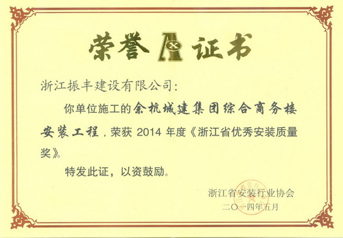 浙江省优秀安装质量奖是我省安装行业质量最高荣誉,我公司承建的余杭城建集团综合商务楼安装工程榜上有名。这是我公司再次获得该项荣誉。