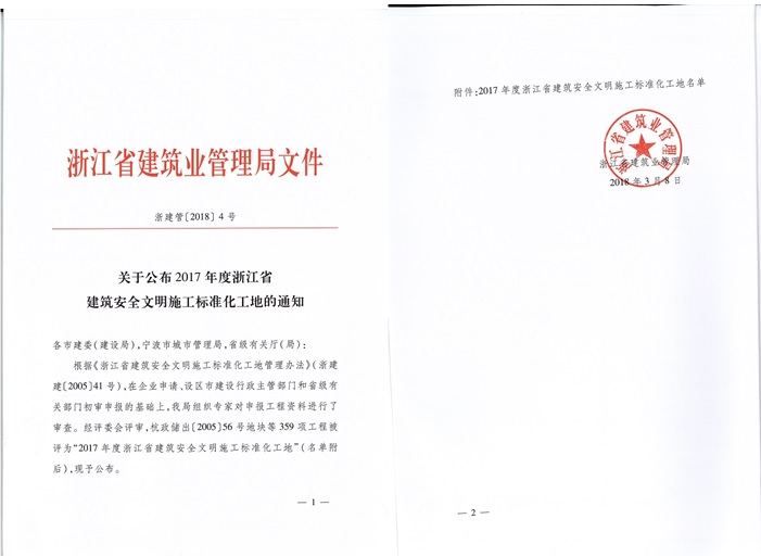 贺我司承建项目喜获2017年度浙江省建筑安全文明施工标准化工地称号