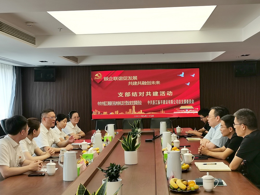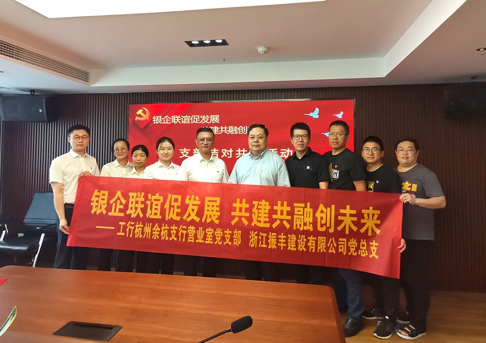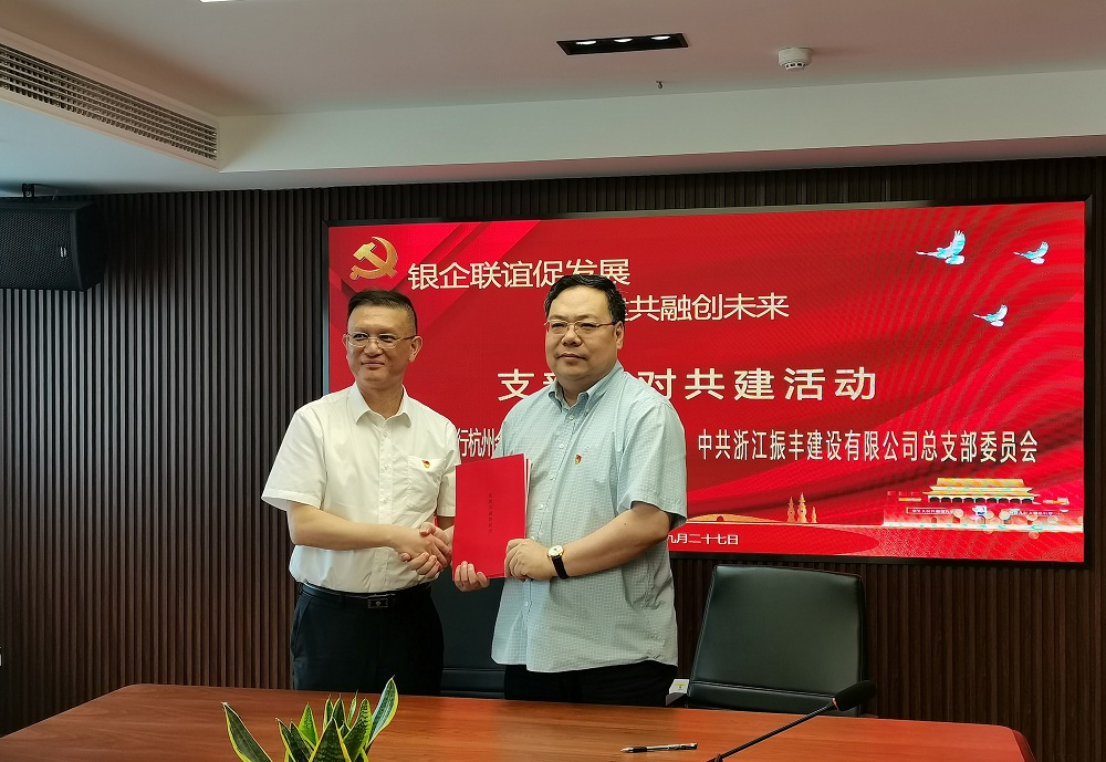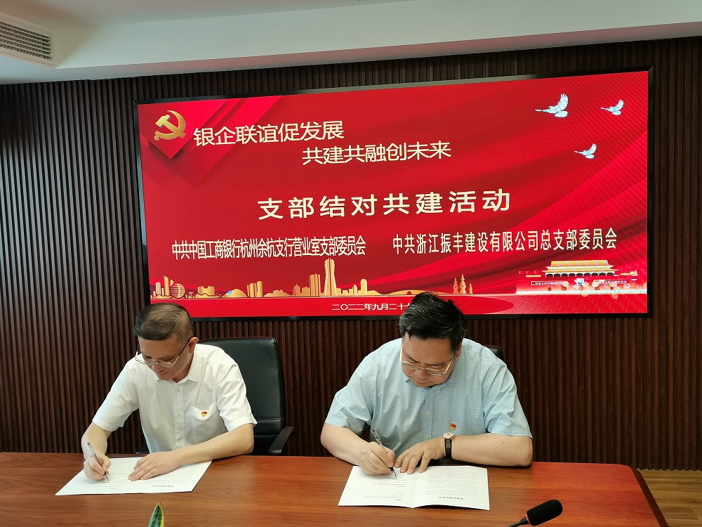 为深入贯彻党的十九大精神,喜迎二十大的召开,以支部为结对共建载体,提升党建工作的整体合力,9月27日上午,中共浙江振丰建设有限公司党总支委员会、中共中国工商银行杭州余杭支行营业室支部委员会党建联建签约仪式在浙江振丰建设有限公司会议室隆重举行。公司总支书记徐祖雷、工行杭州余杭支行营业室书记章帆等与会。